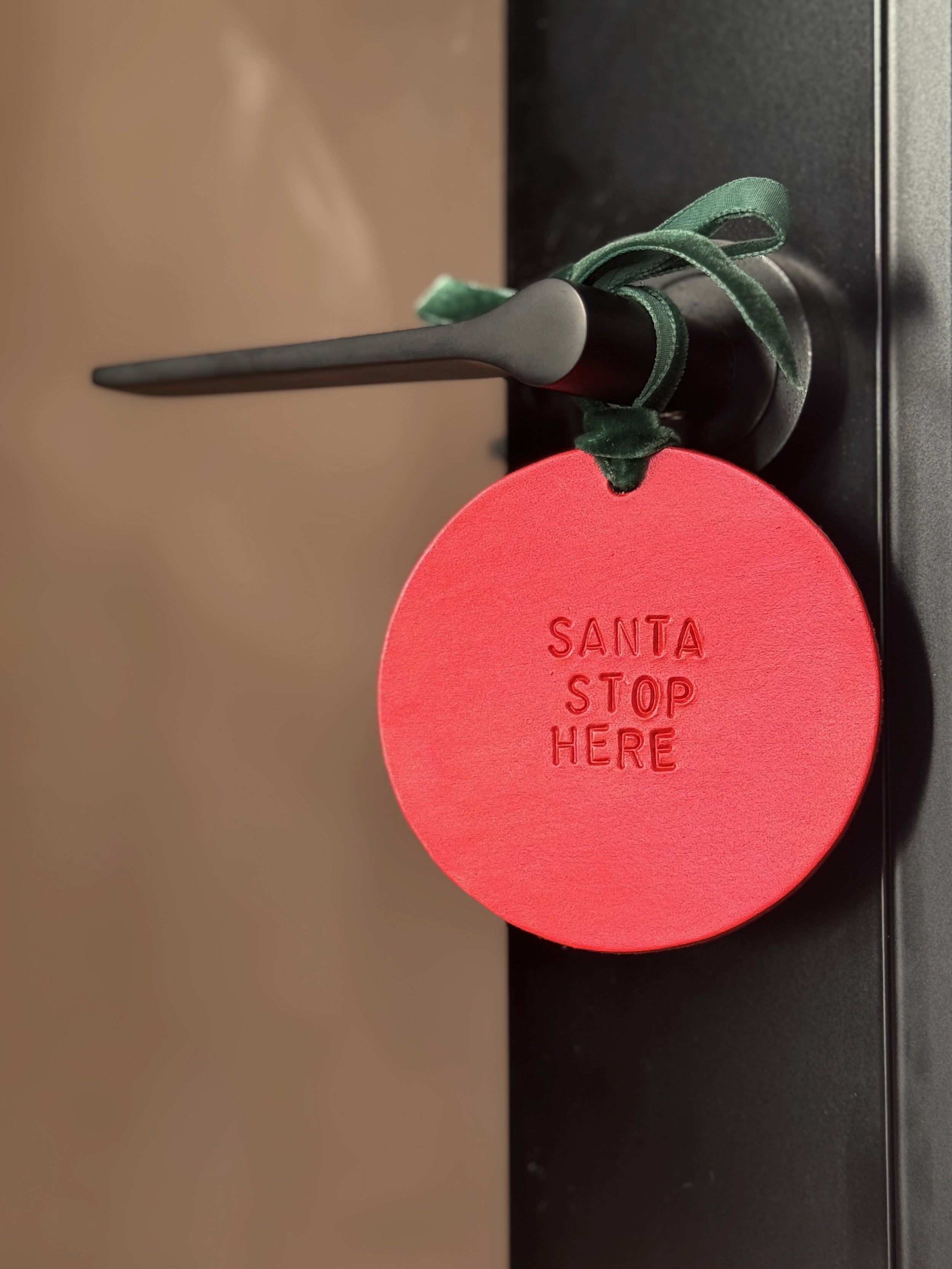 Bring a touch of festive magic to your home with our handcrafted leather Christmas door hanger, beautifully stamped with your choice of message. Whether it’s “Isaac Believes”, “Santa Stop Here”, or something entirely your own, each piece is made to order and finished by hand in our Surrey studio.