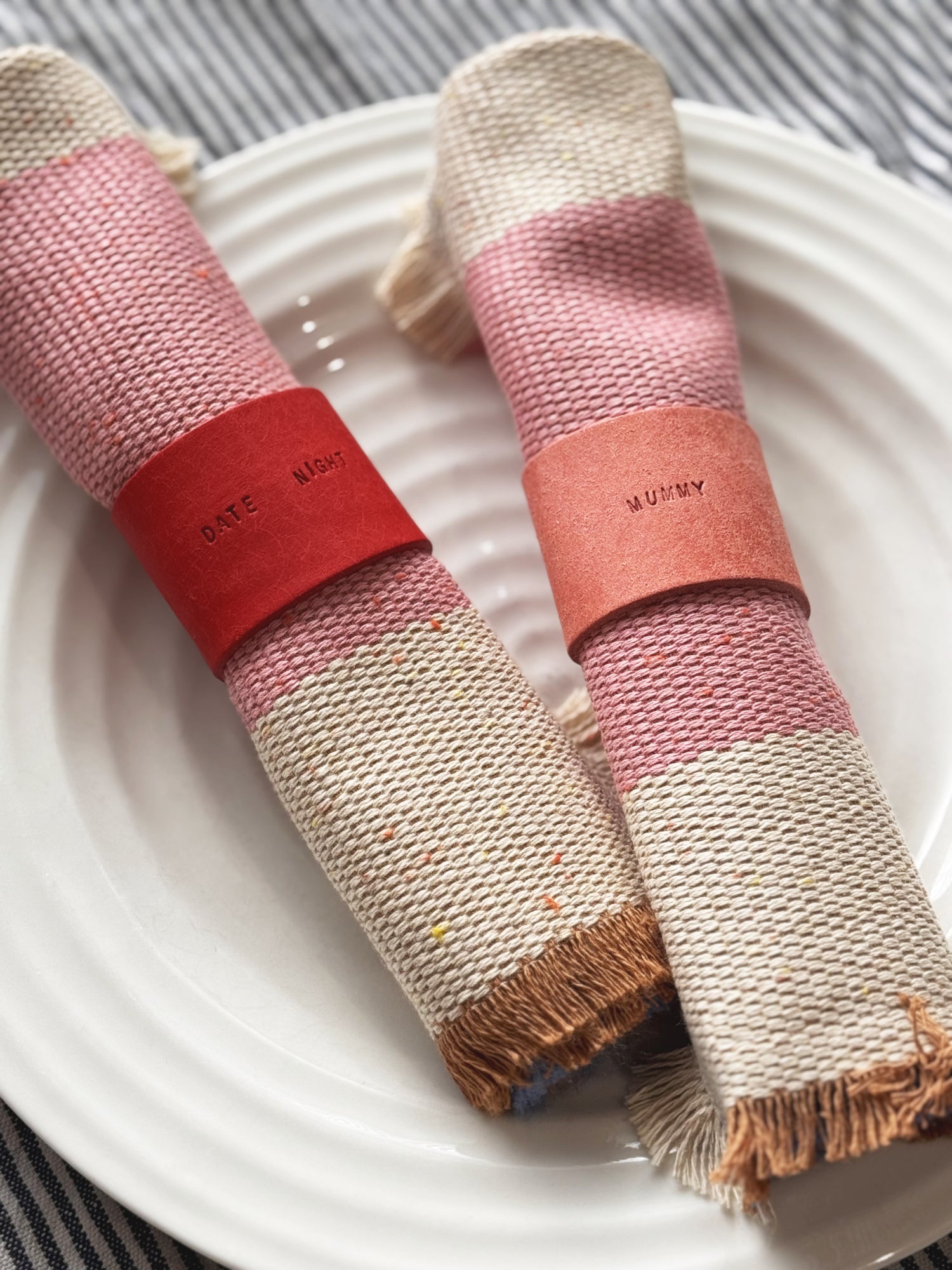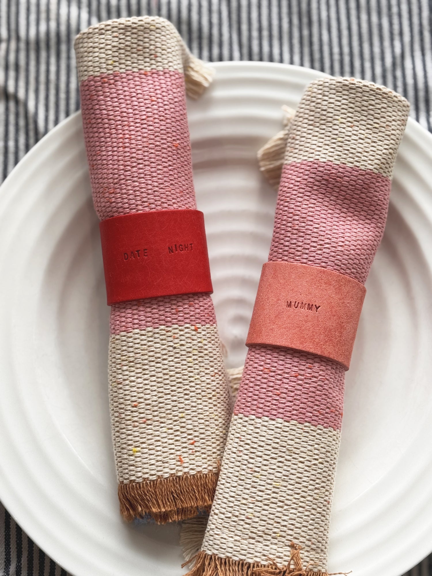 Each napkin ring is cut from premium leather and individually hand stamped with your chosen name or short phrase. Whether it’s “Mummy”, “Date Night”, family names around the table or something uniquely yours, the subtle personalisation adds warmth without fuss.